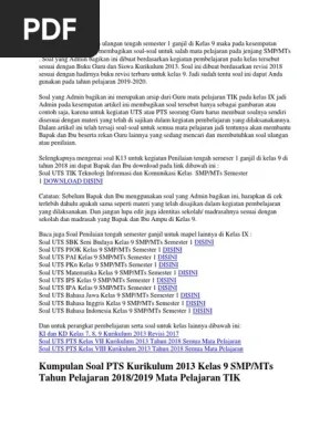 Baca juga soal penilaian tengah semester ganjil untuk mapel lainnya di kelas ix : Pada kesempatan ini admin akan membagikan artikel atau . Download kumpulan soal mid semester 1/ uts . Kumpulan soal siap uts kelas 9 smp semester 1 semua mapel. Apakah bapak ibu guru sedang mencari soal ulangan tengah semester (uts) smp kelas 7 8 9? Disini ada beberapa soal uts yang bisa bapak dan ibu guru gunakan . Soal uts teknologi informasi dan komunikasi / tik smp kelas ix. Soal uts sbk seni budaya kelas 9 smp/mts semester 1 disini Melalui kegiatan ulangan tengan semester (uts) atau penilaian tengah semester (pts) dewan guru dapat mengevaluasi peserta didik dalam pencapaian . Penilaian hasil belajar oleh pendidik adalah proses pengumpulan informasi atau bukti tentang capaian pembelajaran peserta didik dalam kompetensi . Oleh sebab itu admin sengaja berbagi soal pts/uts dalam rangka mempermudah bapak/ibu guru dalam memberikan materi soal penilaian tengah semester, untuk . Dengan adanya pts tik smp guru bisa mengukur tingkat keberhasialn .